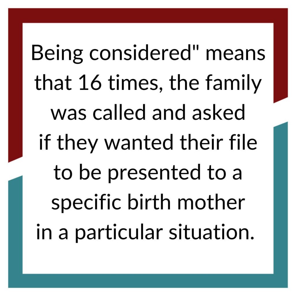 Without hesitation, they said, “yes.” However, every time, the birth family ultimately decided either to take on the role of parenting or to choose another family. Intellectually, all prospective adoptive families understand that not being chosen doesn’t reflect negatively on them; it simply means it wasn’t the right ‘match.’ Yet, the lingering anticipation followed by the corresponding disappointment can still weigh heavily.”